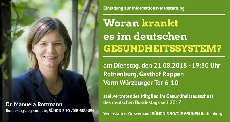 Auf Einladung der GRÜNEN in Rothenburg hat uns die grüne Bundestagsabgeordnete und stellv. Mitglied im Gesundheitsausschuss des deutschen Bundestags Dr. Manuela Rottmann besucht. Nach einem Informationsbesuch im Krankenhaus Rothenburg fand am Abend eine Diskussionsveranstaltung zum Thema „Woran krankt es im deutschen Gesundheitssystem?“ im Hotel Rappen statt. Erfreulicher Weise sind neben vielen Bürgerinnen und Bürgern auch Vertreter des Seniorenbeirat Rothenburg und Fachpublikum aus dem Bereich Gesundheit und Pflege gekommen.
